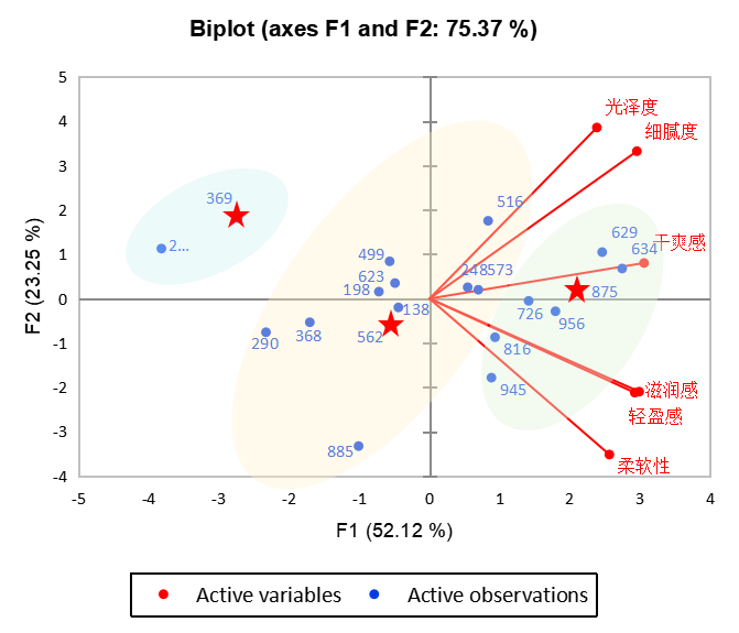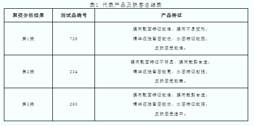 (1)通過感官Q(mào)DA測(cè)試,結(jié)合主成分分析與聚類分析,定位該類面膜的主要感官屬性,總結(jié)3類面膜的膚感特征,選出每一類的代表品;