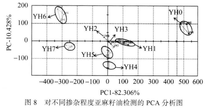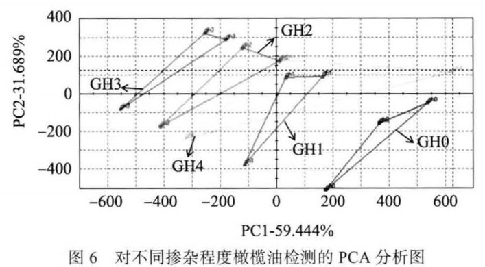 采用AlphaM.O.S公司的電子舌,對6種3組同類型、不同品牌、不同產(chǎn)地、不同生產(chǎn)工藝的油脂摻雜樣品進(jìn)行區(qū)分與識別,其檢測限可低至0.1%,識別指數(shù)為99分。相比于傳統(tǒng)的食用油摻假檢測,如油脂理化指標(biāo)檢測、氣相色譜法等,電子舌的檢測方法更靈敏,更準(zhǔn)確,并且可以區(qū)分成分相近的同種油脂,該檢測方法有助于食用油的地區(qū)保護(hù)、品牌保護(hù)。