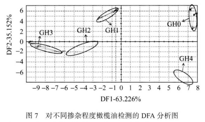 從7根傳感器中優(yōu)化篩選了CA、JE、HA 3根判別能力較強的傳感器對樣品的味覺信息進(jìn)行采集和分析。數(shù)據(jù)處理采用了PCA法和DFA法,其中DFA法要優(yōu)于PCA法,且2種方法的指紋分辨指數(shù)多高于97%,在油脂樣品摻雜量很小的情況下依然可以區(qū)分。