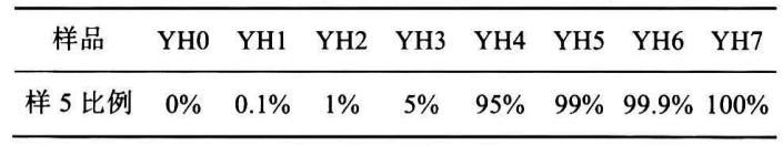 由圖6可知,2個主成分的貢獻(xiàn)率分別為59.444%、31.689%,總貢獻(xiàn)率可達(dá)9l_3l%,其中GH0為純的4號樣,GH4為純的3號樣,二者數(shù)據(jù)點分布區(qū)分明顯,并且由樣GHI與二者數(shù)據(jù)分布較遠(yuǎn)可以得出,檢測限可低至0.1%,仍可區(qū)分。由圖7可知,DFA方法的2個主成分貢獻(xiàn)率為63.226%、35.152%,總貢獻(xiàn)率可達(dá)98.38%,且純的3號樣與純的4號樣區(qū)分明顯,各摻雜比例的數(shù)據(jù)點分布也無重復(fù)區(qū)域。比較圖6,圖7可以看出DFA方法明顯優(yōu)于PCA方法。且2種方法都可以明顯地區(qū)分這兩者的摻雜。