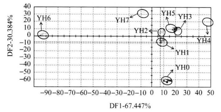 采用PCA法對第3組樣品進(jìn)行分析,由圖8可得出,優(yōu)化傳感器后,2個主成分的貢獻(xiàn)率分別為82.306%、10.428%,總貢獻(xiàn)率達(dá)到92.734%,不同樣品組的數(shù)據(jù)點分布在4個象限,YH2與YH3有小部分重疊,其他樣品在主成分分析圖上可以較好區(qū)分,說明提取的信息能基本反映數(shù)據(jù)信息。由圖9可以看出,判別因子1和判別因子2的貢獻(xiàn)率為67.447%、30.364%,總貢獻(xiàn)率為97.811%,其中YH3與YH2有重疊,其他樣品可較好分開,分布在3個不同象限且組內(nèi)的數(shù)據(jù)點比較集中。綜合比較圖8、9,可得出2種方法均能對亞麻籽油混樣進(jìn)行區(qū)分,而DFA法要優(yōu)于PCA法。