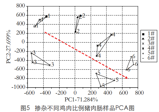圖5為摻雜不同雞肉比例豬肉腸樣品的主成分分析二維圖。從圖5可見前2個(gè)主成分的貢獻(xiàn)率分別為71.284%、27.699%,累計(jì)貢獻(xiàn)率98.983%,其余主成分貢獻(xiàn)率僅為1.017%,所以取前2個(gè)主成分對(duì)應(yīng)的特征向量所決定的兩維子空間就能夠完全反映樣品的整體數(shù)據(jù)信息。同時(shí),從圖5還可以看出,摻雜不同雞肉比例的豬肉腸樣品分別聚類在PCA圖中的不同區(qū)域,所有樣品相互之間能夠較好地區(qū)分,顯著性非常高。聚類區(qū)域分布也呈現(xiàn)出一定的規(guī)律性,隨著摻雜雞肉比例的增加,分布區(qū)域總體按圖中標(biāo)注虛線的方向發(fā)展,即朝PC1增加、PC2下降的方向發(fā)展,同時(shí)不同分布區(qū)域的距離并沒有因?yàn)閾诫s雞肉比例的增加而出現(xiàn)顯著的變化。