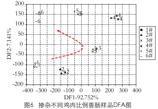 圖6為摻雜不同雞肉比例的香腸樣品判別因子分析圖。從圖6可見前2個(gè)判別因子的貢獻(xiàn)率分別為92.752%、7.141%,累計(jì)貢獻(xiàn)率99.893%。樣品在圖中的分布按照箭頭所示的方向呈現(xiàn)一定的規(guī)律性。具體分析來看,隨著摻雜雞肉比例的增加,分布區(qū)域朝DF1先增加后降低、DF2螺旋上升的趨勢發(fā)展。結(jié)果表明,摻雜不同雞肉比例豬肉腸樣品的DFA分析聚類十分顯著。