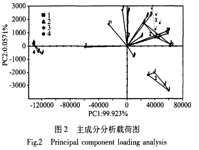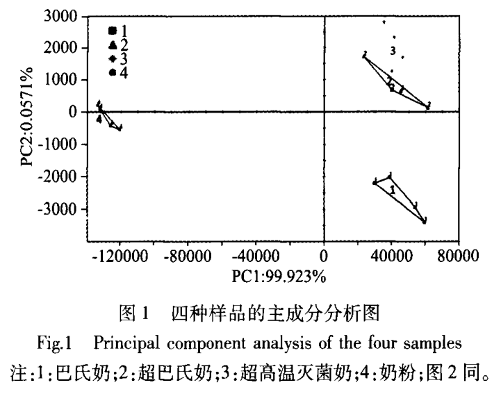 數(shù)據(jù)處理 對(duì)電子鼻采集的樣品數(shù)據(jù)運(yùn)用儀器Alphasoft軟件中多變量統(tǒng)計(jì)分析,來(lái)實(shí)現(xiàn)主成分分析、樣品間區(qū)別指數(shù)分析和主成分載荷圖分析;結(jié)合保留指數(shù)和AroChembase數(shù)據(jù)庫(kù)對(duì)未知化合物進(jìn)行定性分析。 結(jié)果與分析 主成分分析(PCA) 對(duì)四種不同處理方式的牛奶作PCA分析,結(jié)果如圖1所示。第一主成分的方差貢獻(xiàn)率為99.923%,第二主成分的方差貢獻(xiàn)率為0.0571%,兩者累積的總貢獻(xiàn)率為99.97%,表明此圖譜能夠較好地反應(yīng)出所測(cè)樣品中氣味數(shù)據(jù)的完整性。同時(shí),判別指數(shù)(discrimination index,DI)是數(shù)據(jù)統(tǒng)計(jì)軟件分析PCA時(shí)用于表征樣品之間區(qū)分度的體現(xiàn)。DI值在80~100之間表示該數(shù)據(jù)區(qū)分分析結(jié)果為有效結(jié)果,DI值越大效果越佳。圖中PCA的判別指數(shù)為87,表明此樣品間的區(qū)分效果為有效區(qū)分。在主成分分析中,樣品之間的相對(duì)距離越近,表明樣品的整體氣味越近,則差異越小,反之差異則越大。 從圖1中可以看出四種加工方式的樣本之間均存在著較為明顯的差異,其中奶粉與其他三種加工方式樣品的相對(duì)氣味距離均較遠(yuǎn),差異較大。超巴氏奶與超高溫滅菌奶的氣味距離相對(duì)較近,表明差異較小。