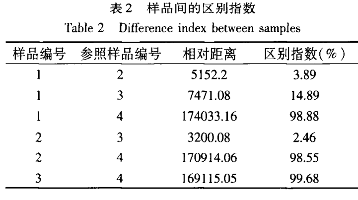 樣品間區(qū)別指數(shù)分析 區(qū)別指數(shù)是基于主成分分析圖中的兩個(gè)樣品組簇團(tuán)之間的相對(duì)距離計(jì)算而出的,兩個(gè)樣品組間簇團(tuán)距離越大同時(shí)樣品組內(nèi)的差異越小,則兩個(gè)樣品組的區(qū)別指數(shù)就越接近100%,即區(qū)別指數(shù)越大則表示樣品組間的區(qū)別越大,反之越小。如表2所示,4號(hào)奶粉樣品與1號(hào)巴氏奶、2號(hào)超巴氏奶及3號(hào)超高溫滅菌奶的區(qū)別指數(shù)均較大,且與3號(hào)超高溫滅菌奶的差異最大。同時(shí),2號(hào)超巴氏奶與3號(hào)超高溫滅菌奶的區(qū)別指數(shù)最小,則表明差異最小。