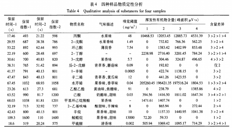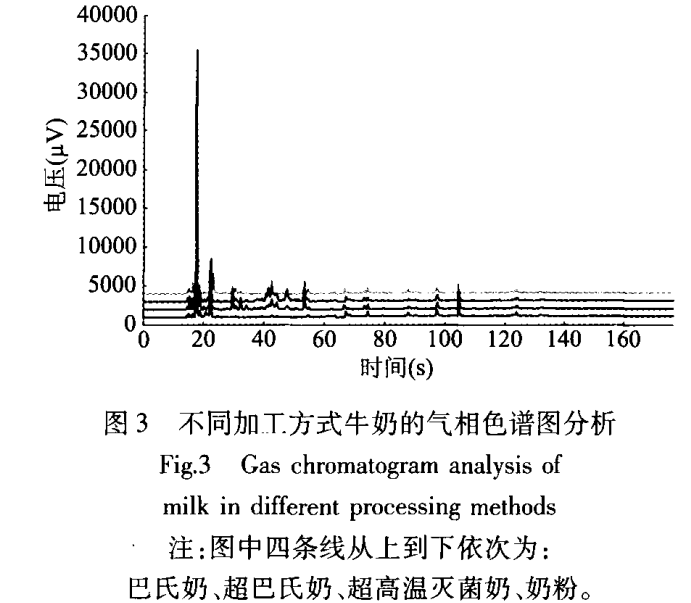 物質(zhì)定性分析 結(jié)合保留指數(shù)和Aro Chem base數(shù)據(jù)庫(kù)對(duì)特異性化合物進(jìn)行定性及含量分析,不同加工方式牛奶的氣相色譜圖如圖3所示,可能含有的化合物見(jiàn)表4所示。閾值的大小代表了物質(zhì)氣味的強(qiáng)弱,相同含量的兩種物質(zhì),閾值越低則表示氣味越強(qiáng)烈。在表4物質(zhì)定性中假設(shè)各物質(zhì)含量相同的前提下,水介質(zhì)中氣味最強(qiáng)的物質(zhì)是1一辛烯(閾值是5X 10‘4)。同時(shí),由于儀器的檢測(cè)器是氫離子火焰檢測(cè)器,為質(zhì)量型檢測(cè)器,物質(zhì)含量的高低則表現(xiàn)在峰面積大小上,表4中列出了在各個(gè)保留時(shí)間上的峰面積,并通過(guò)峰面積大小對(duì)樣品含量的差別進(jìn)行排序。結(jié)果顯示隨著加工溫度升高,丙酮、2一丁醇、辛二烯、己酸和甲硫醚的含量也隨之增多。同時(shí),甲基環(huán)己烷羧酸、丙酮、2一丁醇和水芹烯在奶粉的加工工藝中出現(xiàn)了大量的損失。甲硫醚是牛乳產(chǎn)品中特有的有機(jī)化合物,且其嗅覺(jué)閾值較低,氣味強(qiáng)度較高,其含量稍高便會(huì)產(chǎn)生異味。如表4所示,甲硫醚在巴氏奶中的含量比在超巴氏和超高溫滅菌奶中的低,因此加工工藝對(duì)甲硫醚的含量產(chǎn)生了一定的影響,從而影響了樣品的整體風(fēng)味。