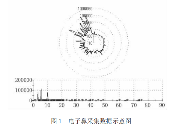 在獲得人工感官評(píng)分后,按醇香、陳香、焦香和異香分別對(duì)采集到的數(shù)據(jù)進(jìn)行定量, 同時(shí)通過(guò)化學(xué)計(jì)量學(xué)方法使用多變量統(tǒng)計(jì)軟件進(jìn)行分析并建立定量模型。采集到的數(shù)據(jù)形式如同氣相色譜圖,見(jiàn)圖 1,下半部分是氣相色譜圖,而上半部分是對(duì)應(yīng)的雷達(dá)圖。將圖中每一個(gè)色譜峰都看作一個(gè)傳感器, 而影響不同香氣的指標(biāo)對(duì)應(yīng)著不同的傳感器,稱(chēng)之為特征傳感器。同時(shí),對(duì)各項(xiàng)指標(biāo)進(jìn)行的定量評(píng)分研究也都立足于特征傳感器的選擇上。