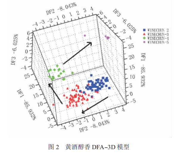 從圖 2 可看出, 醇香評(píng)分為 2、3、4、5 分樣品的分布具有明顯規(guī) 律 性。圖 中 DF1 占 85.9 %、DF2 占 8.0 %、DF3 占 6.0 %,對(duì)于分?jǐn)?shù)為 2 分和 3 分的酒樣與 4 分和 5分的酒樣沿 DF2 和 DF3 呈規(guī)律的線(xiàn)性變化,得分為 3 分和 4 分的酒樣沿 DF1 呈規(guī)律的線(xiàn)性變化。說(shuō)明醇香差異由此三因素形成,其中 DF1 為最主要影響因素。