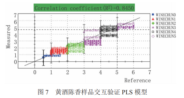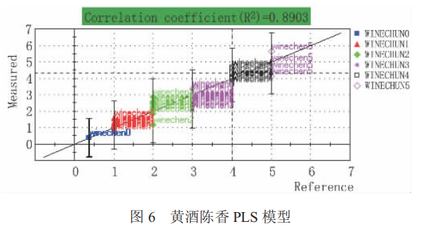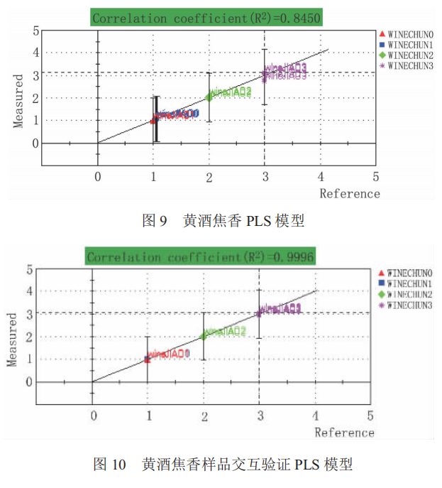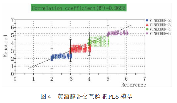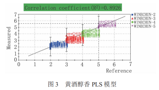 實(shí)驗(yàn)結(jié)果顯示,從醇香、陳香、焦香這 3 個(gè)因素來(lái)對(duì)黃酒的香氣成分分別建立定量模型,進(jìn)行交互驗(yàn)證后,準(zhǔn)確率分別達(dá)到 97.3 %、97.3 %和 94.6 %。本項(xiàng)目研究是基于電子鼻技術(shù)替代人體嗅覺(jué)系統(tǒng)對(duì)黃酒的香氣進(jìn)行系統(tǒng)化評(píng)價(jià)的定量模型,其預(yù)測(cè)結(jié)果重復(fù)性好、準(zhǔn)確度高,可以在生產(chǎn)、 鑒評(píng)過(guò)程中替代品酒員而應(yīng)用于黃酒的香氣感官品評(píng),有效減少人為誤差。