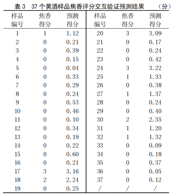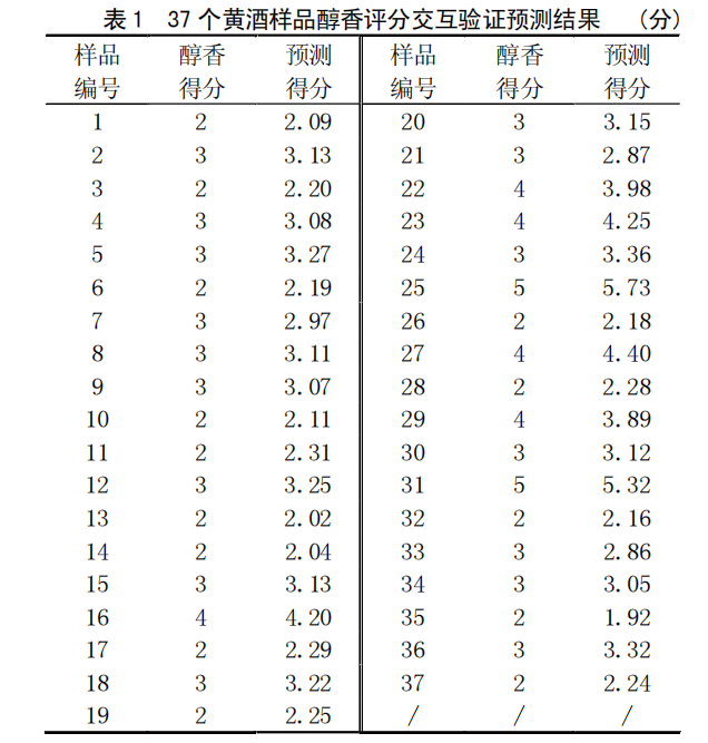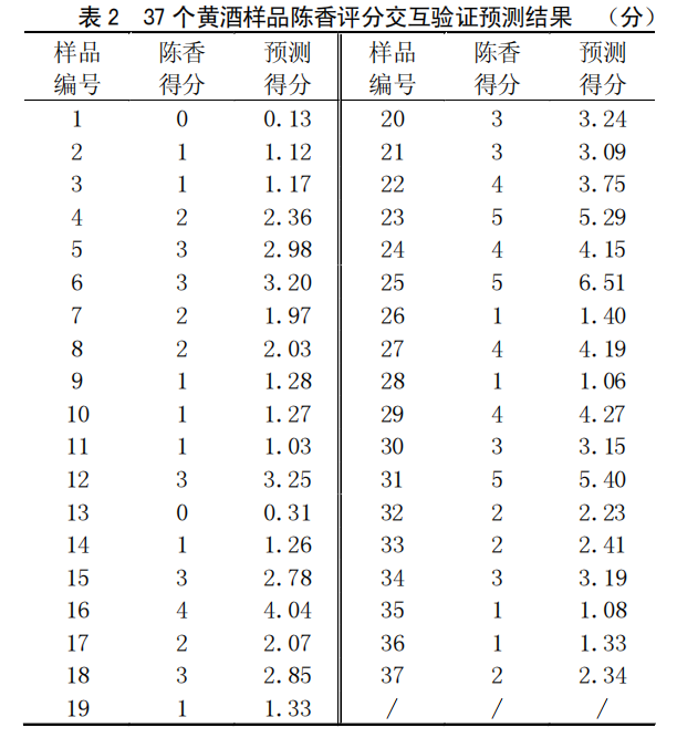 從表 1 可以看出, 所有樣品的醇香得分經(jīng)交互驗(yàn)證顯示,驗(yàn)證準(zhǔn)確率為 97.3 %。其中 25 號(hào)樣品醇香分值為5 分的酒樣,其預(yù)測(cè)得分略高,查得此樣品為 40 年陳釀,而 31 號(hào)樣品醇香分值為 5 分,預(yù)測(cè)結(jié)果相對(duì)接近,查得此樣品為 20 年陳釀。這可能是由于二者年份上的差異加上評(píng)分機(jī)制最高為 5 分,而導(dǎo)致預(yù)測(cè)結(jié)果略有偏離。在實(shí)際感官品評(píng)時(shí),不影響其得到最高分值。
