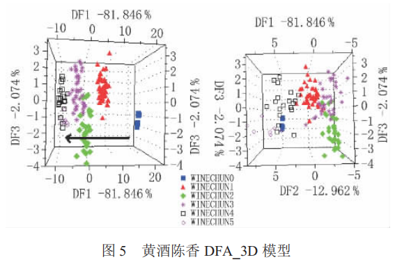 由圖 5 看出, 陳香分值沿圖 5 左圖中所示箭頭方向遞增,其中 DF1 占 81.8 % 、DF3 占 2.1 %。從圖 5 中左圖可以看到,在 DF1 方向上,陳香分值為 4 分和 5 分的樣品差異不明顯,其余分值差異較明顯,這說(shuō)明在陳香分值為 0~4 分的酒樣中,DF1 占最主要因素;而在圖 5 中右圖所示陳香分值為 4 分和 5 分的酒樣差異較明顯, 這說(shuō)明 DF2 和 DF3 在陳香分值為 4~5 分的酒樣區(qū)分中占主要因素,圖 5 中 DF2 占 13.0 %。
