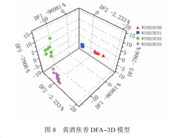 從圖 8 中可以看出,4 個(gè)焦香分值的酒樣分布具有顯著的區(qū)域性。在區(qū)別 0 分與 1 分的酒樣時(shí) DF2 占主要因素;區(qū)別 1 分與 2 分的酒樣時(shí) DF1 占主要因素;區(qū)別 2 分與 3 分的酒樣時(shí) DF3 占主要因素。圖中 DF1 占97.0 %,DF2 占 2.2 %,DF3 占 0.8 %。