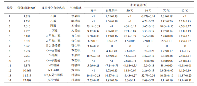 表5 不同干燥條件下紫蘇的揮發(fā)性風(fēng)味物質(zhì)分析