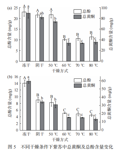 2.冷凍干燥、自然陰干及50℃干燥三種條件下總酚含量無顯著性差異(P>0.05),總黃酮含量雖有差異,但不甚明顯。當(dāng)溫度提高至60℃后總酚及總黃酮含量明顯下降。對于紫蘇莖,冷凍干燥品的總酚及總黃酮含量均最高;其次為自然陰干品及50℃干燥品,且二者無顯著性差異(P>0.05),當(dāng)溫度提高至60℃后,總酚及總黃酮含量明顯下降。