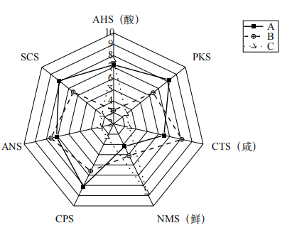 圖2是樣品電子舌滋味強度雷達圖。AHS(酸)、CTS(咸)、NMS(鮮)為專一性傳感器,PKS、CPS、ANS、SCS為非專一性傳感器。圖中可以看出在酸味維度上,A、C較為相似,與B差異大。導致這種差異的原因可能是鮮花椒芽含有更多水分,稀釋了樣品的呈酸味物質(zhì)所致。在咸味維度,C樣品咸味最弱,B樣品最強。在鮮味維度,C樣品鮮味最強,B樣品略高于A。