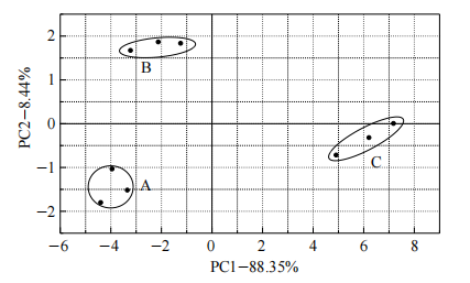 圖3是電子舌和電子鼻數(shù)據(jù)融合主成分分析結(jié)果。PC1+PC2為96.79%(大于80%即可),說明在進行數(shù)據(jù)降維時,保留了絕大部分樣品的信息,降維可行有效。圖中3個樣品在4個象限均有分布(B在第二象限,A在第三象限,C在第一、四象限均有分布)。A、B差異主要來源于PC2,A、C差異主要來源于PC1。PC1為88.35%,PC2為8.44%。所以A、B差異小,A、B和C差異大,A、C差異最大。說明未添加花椒芽的樣品與添加酥花椒芽的樣品在風味上差異大。