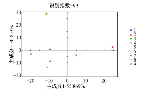 同一品種不同產(chǎn)地生地黃鑒別由圖4可知,PC1與PC2的貢獻(xiàn)率之和達(dá)到了95.057%,其識(shí)別指數(shù)達(dá)到99,說(shuō)明基于氣味上的差異能有效區(qū)分不同產(chǎn)地地黃樣品。河南溫縣與甘肅所產(chǎn)“北京3號(hào)”各單獨(dú)分布在一個(gè)區(qū)域,與其他產(chǎn)區(qū)氣味差別較大;山西與陜西所產(chǎn)“北京3號(hào)”氣味差別較小,利用AroChemBases數(shù)據(jù)庫(kù)對(duì)篩選出的差異較大的色譜峰進(jìn)行定性可知,生地黃氣味差異可能由于乙醛、乙醇、2,3?丁烷、乙腈、己醛等揮發(fā)性氣體含量差異引起,說(shuō)明使用電子鼻能迅速區(qū)分同一品種不同產(chǎn)地生地黃。