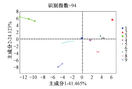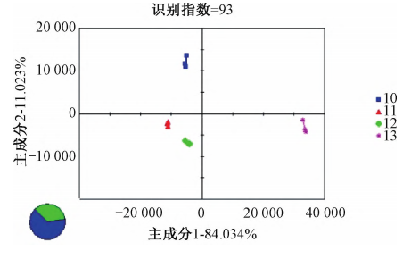 采用Alpha soft軟件對(duì)所得數(shù)據(jù)進(jìn)行分析,利用主成分分析(PCA)法,通過(guò)對(duì)原始數(shù)據(jù)向量進(jìn)行線(xiàn)性變換,對(duì)多個(gè)數(shù)據(jù)進(jìn)行降維處理,轉(zhuǎn)化為少數(shù)綜合指標(biāo)。