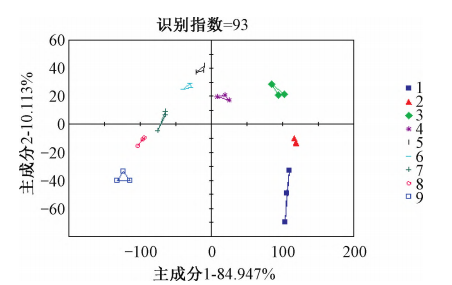 懷區(qū)9種不同主栽品種懷地黃RSD分別為0.42%、1.35%、0.56%、0.34%、0.42%、0.22%、0.22%,樣品3次重復(fù)間相對(duì)標(biāo)準(zhǔn)偏差都比較小,說(shuō)明樣品在重復(fù)測(cè)試過(guò)程中電子舌儀器的穩(wěn)定性、重現(xiàn)性好。由圖5可知,PC1與PC2的貢獻(xiàn)率之和達(dá)到了95.060%,其識(shí)別指數(shù)為93,說(shuō)明這9種生地黃樣品滋味能夠快速地通過(guò)電子舌很好區(qū)分開(kāi)來(lái)。在主成分分析圖中,樣品間的相對(duì)距離越近,則樣品整體滋味越接近,其中“金九”與“85?5”樣品的相對(duì)距離最近,滋味差別最?。?ldquo;噸王”與“沁懷”的相對(duì)距離最遠(yuǎn),滋味差別最大。