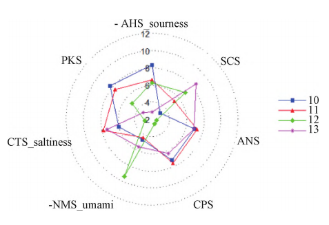 采用第6套傳感器系統(tǒng),包括AHS、PKS、CTS、NMS、CPS、ANS、SCS共7根傳感器。選擇Ag/AgCl作為參比電極,通過(guò)軟件對(duì)信號(hào)值的分析,能夠在0到12的刻度上比較不同樣品間的各種滋味的相對(duì)強(qiáng)度。將生地黃樣品粉碎,過(guò)5號(hào)篩,稱(chēng)?。玻绶勰┯跓?,加入50mL60℃蒸餾水,超聲處理30min,靜置1h,濾紙過(guò)濾后取25mL置于電子舌專(zhuān)用燒杯中待測(cè),重復(fù)3次,每檢測(cè)1個(gè)樣品后對(duì)傳感器進(jìn)行1次徹底清洗。樣品采集時(shí)間為120s,每次分析時(shí)間為180s。