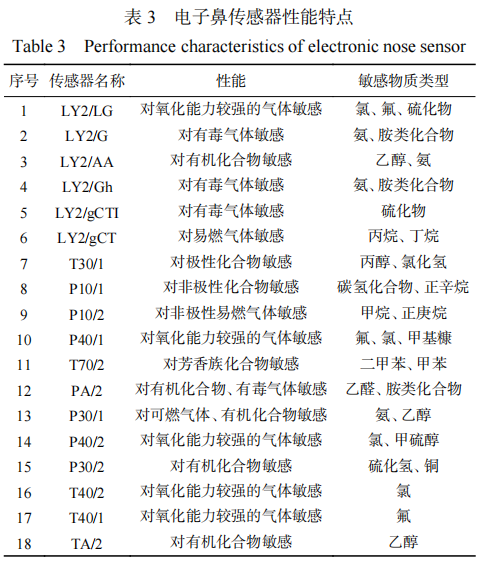 電子鼻分析 法國產(chǎn)電子鼻是通過MXT-5(弱極性)和MXT-7(中極性)色譜柱分離氣味物質(zhì),一共由18根金屬氧化傳感器組成,每根傳感器對應(yīng)一類或幾類物質(zhì)敏感,采用氫離子檢測器分析色譜信息,完成檢測后,即可使用儀器自帶數(shù)據(jù)庫對樣品揮發(fā)性物質(zhì)進(jìn)行定性、定量分析。電子鼻傳感器性能特點(diǎn)見表3。