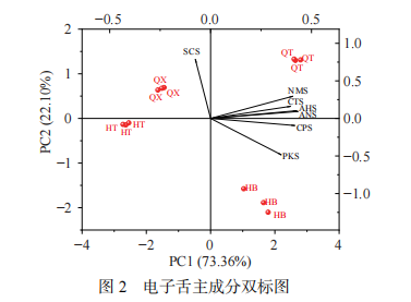 圖2顯示主成分PC1貢獻(xiàn)率為73.36%、PC2貢獻(xiàn)率為22.10%,表明主成分降維后數(shù)據(jù)能反映原數(shù)據(jù)的整體信息,四個樣品分布在四個象限中,無重疊,表明樣品之間存在較明顯差異性。主成分雙標(biāo)圖貢獻(xiàn)影響因子在圖中以線段表示,越靠近樣品所在坐標(biāo)軸,說明影響因子對其影響越大。樣品HT最靠近X軸,且樣品HT與QX相近,滋味相似;樣品HB距離其他樣品較遠(yuǎn),位于第四象限,其滋味差異主要體現(xiàn)在PC1上;結(jié)果表明,電子舌能明顯區(qū)分四個部位樣品,且樣品之間滋味差異明顯。