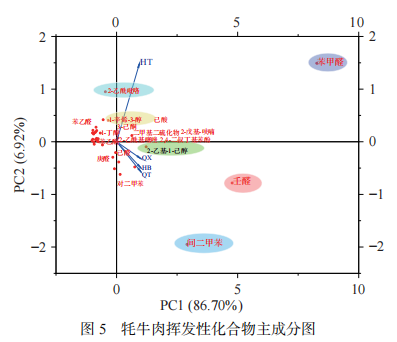 揮發(fā)性化合物數(shù)據(jù)歸一化處理后,進(jìn)行主成分分析。圖5顯示PC1貢獻(xiàn)率86.70%,PC2貢獻(xiàn)率6.92%,表明主成分經(jīng)降維后數(shù)據(jù)能反映原數(shù)據(jù)整體信息;其中,苯甲醛、壬醛、2-乙酰吡咯、2-乙基-1-己醇、間二甲苯相對含量突出,構(gòu)成牦牛肉的主要化合物;樣品HT中苯甲醛(帶有堅果香氣)、2-乙酰吡咯(烤堅果的風(fēng)味)相對含量較高,可以確定牦牛肉后腿帶有堅果風(fēng)味,燒烤后風(fēng)味獨(dú)特;而樣品QX、HB、QT風(fēng)味化合物主要構(gòu)成是壬醛、間二甲苯、2-乙基-1-己醇,位置相對較近,判斷風(fēng)味相似。