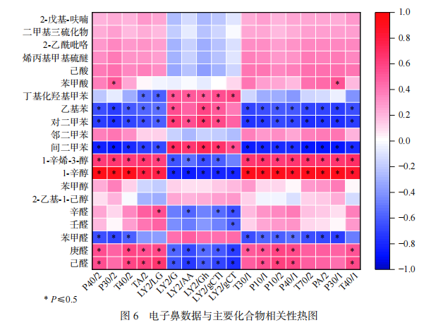 研究表明,取每個類別、相對含量前五揮發(fā)性化合物做相關(guān)性熱圖,可以辨別兩個數(shù)據(jù)之間的關(guān)聯(lián)性和差異性。電子鼻傳感器數(shù)據(jù)是宏觀化合物解析、SPME-GC-MS是具體化合物相對含量,因此有一定的相關(guān)性。采用Pearson相關(guān)性分析,將電子鼻傳感器數(shù)據(jù)與SPME-GC-MS相對含量較高的主要數(shù)據(jù),歸一化處理后,進(jìn)性相關(guān)性分析。r代表反映X軸、Y軸的線性相關(guān)程度,|r|越大相關(guān)性越強(qiáng),|r|越小相關(guān)性越弱(r值在-1~1之間),P≤0.5表示顯著,其結(jié)果如圖6所示。