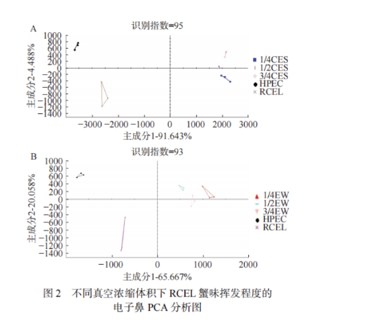 不同真空濃縮體積下RCEL蟹味揮發(fā)程度的電子鼻主成分分析