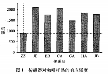 該 實(shí) 驗(yàn) 所 用 的 傳 感 器 為 非 特 異 性 、交 互 敏 感 型 傳 感器 。7個(gè) 傳 感 器 分 別 是 zz、JE、BB、CA、GA、HA 和 JB。各 傳 感 器 對(duì) 風(fēng) 味 物 質(zhì) 普 遍 響 應(yīng) ,沒 有 絕 對(duì) 的 對(duì) 應(yīng) 關(guān) 系 。圖 1表 示 傳 感 器 對(duì) 咖 啡 樣 品 的 響 應(yīng) 強(qiáng) 度 圖 ,其 中 JE 和 CA 對(duì) 咖 啡 樣 品 的 響 應(yīng) 強(qiáng) 度 最 大 ,傳 感 器 響 應(yīng) 強(qiáng) 度 JE>CA>HA>JB。