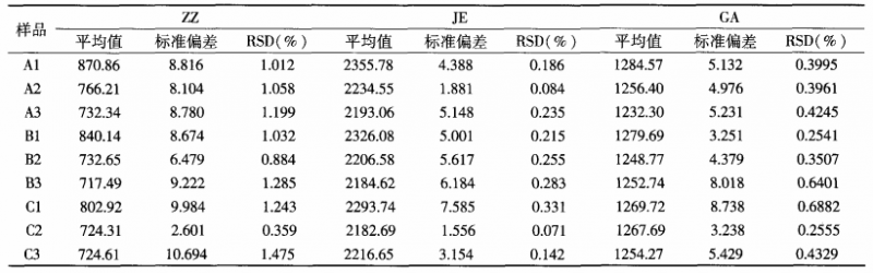 表 1表 示 各 傳 感 器 對(duì) 樣 品 的判 別 指 數(shù) ,而 判 別 指 數(shù) JE >ZZ>GA>JB,可 見 傳 感 器 響 應(yīng) 強(qiáng) 度 與 對(duì) 樣 品 的 差 異 判 別 能 力 不 是 線 性 關(guān) 系 ,如 ZZ雖 響 應(yīng) 強(qiáng) 度 較 小 但 對(duì) 咖 啡 樣 品 有 較 高 的 差 異 判 別 指 數(shù) ,經(jīng) 過 判 別 指 數(shù) 和 響 應(yīng) 強(qiáng) 度 綜 合 確 定 傳 感 器 為 JE、GA 和 ZZ。傳 感 器 對(duì) 咖 啡 樣 品 響 應(yīng) 強(qiáng) 度 值 、標(biāo) 準(zhǔn) 偏 差 和 相 對(duì) 標(biāo) 準(zhǔn) 偏 差 (RSD) 見 表 2。