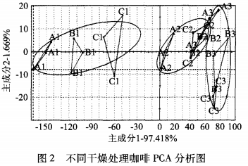 PCA 分 析 能 較 好 的 區(qū) 分 樣 品 ,主 成 分 1的 貢 獻(xiàn) 率 高 達(dá) 97.418% ,主 成 分 2的 貢 獻(xiàn) 率 為 1.669% 。三 組 實(shí) 驗(yàn) 均 能 較 好 區(qū)分 樣 品 ,且 樣 品 2與 樣 品 3之 間 的距 離 遠(yuǎn) 小 于 樣 品 1與 樣 品 3之 間 的 距 離 ,說 明 熱 風(fēng) 干 燥 會(huì) 造 成 咖 啡 風(fēng) 味 變 化 ,其 與 太 陽 光 自然 風(fēng) 味 相 差 較 遠(yuǎn) ,半 熱 風(fēng) 干 燥 半 自然 干 燥 雖 也 會(huì) 造 成 風(fēng) 味 變 化 ,但 與 太 陽 光 自然 干 燥 風(fēng) 味 相 差 不 大 。說 明 半 熱 風(fēng) 干 燥 半 自然 干 燥 是 咖 啡 在 惡 劣 環(huán) 境 下 ,咖 啡 濕 豆 干 燥 有 效 的 補(bǔ) 充 。