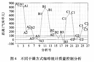 咖 啡 濕 豆 干 燥 通 常 以 太 陽 光 自然 干 燥 為 主 ,該 實(shí) 驗(yàn) 以 太 陽 光 自然 干 燥 為 參 照 對(duì) 象 ,由 于 三 組 重 復(fù) , 均 有 自然 干 燥 。此 采 用 A3為 標(biāo) 準(zhǔn) 進(jìn) 行 SQC分 析 ,經(jīng) 電 子 舌 檢 測(cè) 得 出 圖 4。