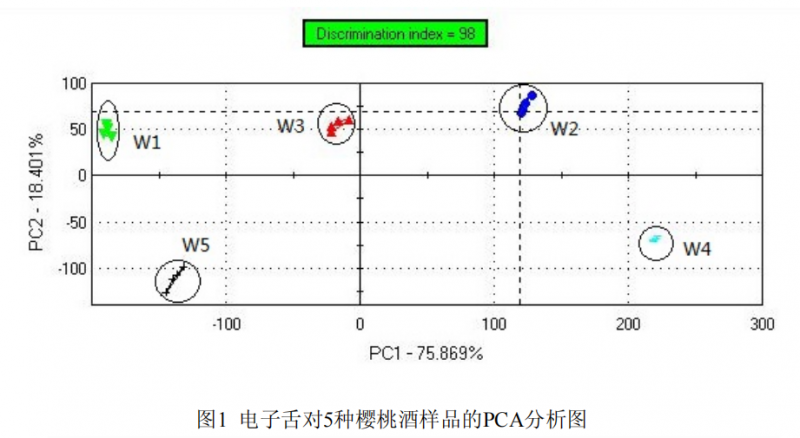 對(duì)電子舌采集得到的數(shù)據(jù)進(jìn)行 PCA 分析,其結(jié)果如圖 1 所示。主成分得分圖以散點(diǎn)圖為基礎(chǔ),每個(gè)點(diǎn)代表一個(gè)樣品,點(diǎn)之間的距離代表樣品之間特征差異的大小。從圖 1 中可看出同一樣品不同批次的重復(fù)進(jìn)樣構(gòu)成一個(gè)獨(dú)立的組群,表示分析的重復(fù)性合格。主成分 1(PC1)和主成分 2(PC2)的累積方差貢獻(xiàn)率為 94.27%,這說(shuō)明 PC1 和 PC2已經(jīng)包含了較大的信息量,能夠反映樣品的整體信息,可將不同的櫻桃酒在 PCA 圖中明顯的區(qū)分開(kāi)來(lái)。