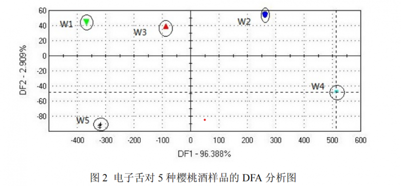 將電子舌采集得到的數(shù)據(jù)進(jìn)行 DFA 分析,結(jié)果如圖 2 所示。由圖 2 可知,DFA 對(duì)櫻桃酒樣品的累積區(qū)分指數(shù)達(dá)到了 99.297%(DF1 為 96.388% ,DF2 為 2.909%),DFA 法能夠?qū)悠烽g差異有更好的區(qū)分度,并且同一樣品組內(nèi)的離散度也比 PCA 法(圖 1)的小,不同樣品組間的區(qū)分更明顯。