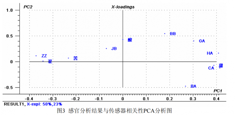 對(duì)感官分析結(jié)果與電子舌數(shù)據(jù)進(jìn)行PCA相關(guān)性分析,如圖3所示。主成份1和2反映了樣品的大都分信息,在圖上距離越近,說(shuō)明樣品與傳感器的相關(guān)性越強(qiáng)。由圖3 可知,傳感器ZZ與澀、苦味的相關(guān)性較好,傳感器JB與酸味相關(guān)性較強(qiáng),而傳感器HA、CA與甜味的相關(guān)性較好。