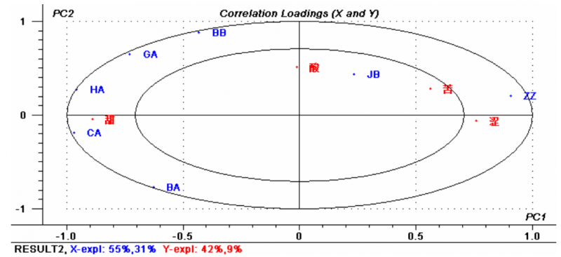 為了進(jìn)一步確認(rèn)感官分析結(jié)果與電子舌數(shù)據(jù)的相關(guān)性,對(duì)兩者進(jìn)行PLSR分析, 7個(gè)不同的傳感器(ZA、BB、BA、GA、HA、JB、CA)作為X變量,感官屬性(酸、甜、苦、澀)作為Y變量,如 圖 4 所示。該 PLSR 模型的方差貢獻(xiàn)率為PC1=55%,PC2=42%。圖4是感官屬性與傳感器的相關(guān)性載荷圖,圖中的兩個(gè)橢圓,分別表示50%和100%的方差貢獻(xiàn)率。傳感器ZA、BB、BA、GA、HA、CA和感官屬性澀、和甜味位于兩個(gè)橢圓之間,說(shuō)明該模型可以對(duì)這些變量具有更好的解釋能力。由圖4可知,傳感器ZZ與澀、苦味的相關(guān)性較好,傳感器JB與酸味相關(guān)性較強(qiáng),而傳感器HA、CA與甜味的相關(guān)性較好。此相關(guān)性結(jié)果與圖3 PCA的相關(guān)性結(jié)果相符合。