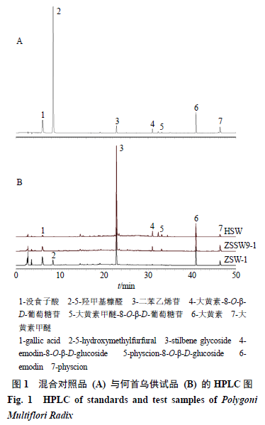2.2.2 對(duì)照品溶液的制備 精密稱(chēng)定沒(méi)食子酸、5-羥甲基糠醛、二苯乙烯苷、大黃素-8-O-β-D-葡萄糖苷、大黃素甲醚-8-O-β-D-葡萄糖苷、大黃素、大黃素甲醚對(duì)照品各適量,分別加80%甲醇制成質(zhì)量濃度分別為57.6、68.4、625.0、50.2、8.6、180.0、0.216 μg/mL的對(duì)照品溶液,即得。 2.2.3 供試品溶液的制備 取何首烏飲片粉末(過(guò)40目篩)約1 g,精密稱(chēng)定,置平底燒瓶中,精密加入80%甲醇25 mL,密塞,稱(chēng)定質(zhì)量,加熱回流提取30 min,放冷,密塞,再稱(chēng)定質(zhì)量,用80%甲醇補(bǔ)足減失的質(zhì)量,搖勻,經(jīng)微孔濾膜(0.45 μm)濾過(guò),即得。 2.2.4 線(xiàn)性關(guān)系考察 分別精密吸取對(duì)照品溶液1、5、10、15、20、25 μL,注入液相色譜儀,按“2.2.1”項(xiàng)下色譜條件測(cè)定,以對(duì)照品質(zhì)量濃度為橫坐標(biāo)(X),峰面積為縱坐標(biāo)(Y)繪制標(biāo)準(zhǔn)曲線(xiàn),并計(jì)算得到回歸方程與線(xiàn)性范圍,結(jié)果分別為沒(méi)食子酸Y=28 655.693 5 X-3 449.895 2,R2=1.000 0,線(xiàn)性范圍5.76~144.00 mg/L;5-羥甲基糠醛Y=78 294.955 3 X+11 679.404 8,R2=1.000 0,線(xiàn)性范圍6.84~171.00 mg/L;二苯乙烯苷Y=16 640.258 1 X+12 599.471 0,R2=0.999 9,線(xiàn)性范圍62.50~1 562.50 mg/L;大黃素-8-O-β-D-葡萄糖苷Y=30 743.247 5 X-9 558.630 6,R2=0.999 9,線(xiàn)性范圍5.02~125.50 mg/L;大黃素甲醚-8-O-β-D-葡萄糖苷Y=27 693.578 4 X-241.880 6,R2=1.000 0,線(xiàn)性范圍0.86~21.50 mg/L;大黃素Y=34 965.433 1 X-22 341.082 3,R2=0.999 9,線(xiàn)性范圍18.00~450.00 mg/L;大黃素甲醚Y=37 991.286 3 X+8 456.727 4,R2=1.000 0,線(xiàn)性范圍21.60~540.00 mg/L;結(jié)果表明,各對(duì)照品在各自范圍內(nèi)線(xiàn)性關(guān)系良好。 2.2.5 精密度試驗(yàn) 精密吸取供試品溶液(ZSW-1)10 μL,重復(fù)進(jìn)樣6次,按“2.2.1”項(xiàng)下色譜條件測(cè)定,6次測(cè)定結(jié)果顯示,沒(méi)食子酸、5-羥甲基糠醛、二苯乙烯苷、大黃素-8-O-β-D-葡萄糖苷、大黃素甲醚-8-O-β-D-葡萄糖苷、大黃素、大黃素甲醚峰面積的RSD分別為0.17%、0.39%、0.31%、0.54%、1.64%、0.21%、0.63%,表明儀器精密度良好。 2.2.6 穩(wěn)定性試驗(yàn) 精密吸取供試品溶液(ZSW-1)10 μL,分別于制備后0、2、4、8、12、24 h進(jìn)樣共6次,按“2.2.1”項(xiàng)下色譜條件測(cè)定,結(jié)果沒(méi)食子酸、5-羥甲基糠醛、二苯乙烯苷、大黃素-8-O-β-D-葡萄糖苷、大黃素甲醚-8-O-β-D-葡萄糖苷、大黃素、大黃素甲醚峰面積的RSD分別為0.52%、0.82%、0.36%、1.38%、1.54%、0.39%、0.90%,表明供試品溶液在24 h內(nèi)保持穩(wěn)定。 2.2.7 重復(fù)性試驗(yàn) 取制何首烏粉末(ZSW-1)約1 g,精密稱(chēng)定,共6份,按“2.2.3”項(xiàng)下方法制備供試品溶液,分別精密吸取10 μL,注入液相色譜儀,按“2.2.1”項(xiàng)下色譜條件測(cè)定,記錄峰面積并計(jì)算各成分含量,結(jié)果沒(méi)食子酸、5-羥甲基糠醛、二苯乙烯苷、大黃素-8-O-β-D-葡萄糖苷、大黃素甲醚-8-O-β-D-葡萄糖苷、大黃素、大黃素甲醚含量的RSD分別為0.33%、0.92%、0.08%、1.65%、1.67%、1.59%、1.90%,表明該方法重復(fù)性良好。 2.2.8 加樣回收率試驗(yàn) 精密稱(chēng)定已測(cè)定指標(biāo)成分含量的何首烏粉末(ZSW-1)約0.5 g,共6份,置平底燒瓶中,分別加入對(duì)照品適量,按“2.2.3”項(xiàng)下方法制備供試品溶液。精密吸取上述樣品與對(duì)照品溶液各10 μL,注入液相色譜儀,按“2.2.1”項(xiàng)下色譜條件進(jìn)行測(cè)定,記錄峰面積并計(jì)算加樣回收率,沒(méi)食子酸、5-羥甲基糠醛、二苯乙烯苷、大黃素-8-O-β-D-葡萄糖苷、大黃素甲醚-8-O-β-D-葡萄糖苷、大黃素、大黃素甲醚的平均加樣回收率分別為98.88%、97.99%、97.32%、102.85%、108.12%、96.67%、99.33%,RSD分別為0.36%、0.74%、0.33%、0.74%、0.93%、0.43%、1.16%,均符合《中國(guó)藥典》2020年版規(guī)定標(biāo)準(zhǔn)。 2.2.9 樣品測(cè)定 分別稱(chēng)取生何首烏、九蒸九曬何首烏、藥典法制何首烏飲片適量,按“2.2.3”項(xiàng)下方法制備供試品溶液,每個(gè)樣品平行2次,按“2.2.1”項(xiàng)下色譜條件進(jìn)行測(cè)定,記錄峰面積并計(jì)算各成分含量,結(jié)果見(jiàn)表1。含量測(cè)定結(jié)果表明,何首烏不同飲片中均含有沒(méi)食子酸、二苯乙烯苷、大黃素-8-O-β-D-葡萄糖苷、大黃素甲醚-8-O-β-D-葡萄糖苷、大黃素、大黃素甲醚6種成分,但不同飲片間各成分含量存在一定差異。九蒸九曬、藥典法制何首烏中沒(méi)食子酸及蒽醌苷元類(lèi)成分的含量與生何首烏相比,均有不同程度的增加,其中以沒(méi)食子酸含量增加最為顯著,藥典法制何首烏約為生品的3倍,九蒸九曬何首烏約為生品的2倍。炮制為制何首烏后,苷類(lèi)(二苯乙烯苷、蒽醌苷)成分含量顯著減少,與生何首烏相比,九蒸九曬何首烏中二苯乙烯苷含量減少了約44%,蒽醌苷類(lèi)成分含量減少了約41%;藥典法制何首烏中二苯乙烯苷含量減少了約69%,蒽醌苷類(lèi)成分含量減少了約85%;而5-羥甲基糠醛僅在藥典法制何首烏飲片中檢出,平均質(zhì)量分?jǐn)?shù)為0.506 1 mg/g。