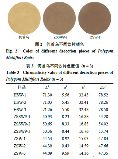 2.3.1 視覺(jué)分析儀參數(shù)設(shè)置及供試品前處理 開(kāi)啟IRIS視覺(jué)分析儀,預(yù)熱15 min,待指示燈顯示綠燈后,校準(zhǔn)儀器鏡頭的曝光度和焦距,使用24色色彩校正板對(duì)儀器進(jìn)行校準(zhǔn)。校準(zhǔn)完成后設(shè)置照明模式為頂部及底部照明,拍照模式為單一快照。取適量何首烏供試品粉末(過(guò)40目篩)于扁形稱(chēng)量瓶中,壓平,置于儀器測(cè)量白板上,變換位置,平行拍照3次,記錄樣品粉末色號(hào)及比例,計(jì)算樣品色度空間參數(shù)L*、a*、b*值、樣品色度值(Eab*值)及各樣品間的ΔEab值。 2.3.2何首烏不同飲片顏色比較 觀(guān)察各樣品顏色,可見(jiàn)何首烏不同飲片顏色差異明顯,結(jié)果見(jiàn)圖2。何首烏不同飲片樣品色度值比較見(jiàn)表3。經(jīng)電子眼測(cè)定,九蒸九曬何首烏與生何首烏的ΔEab>6.0,顏色色差感覺(jué)很明顯,兩者ΔL*為負(fù),Δa*為正,Δb*為負(fù);藥典法制何首烏與生何首烏的ΔEab>6.0,顏色色差感覺(jué)很明顯,兩者ΔL*為負(fù),Δa*為正,Δb*為負(fù),說(shuō)明經(jīng)九蒸九曬及藥典法炮制后何首烏飲片顏色均變深變紅變藍(lán);藥典法制何首烏與九蒸九曬何首烏的ΔL*為負(fù),Δa*為正,Δb*為負(fù),說(shuō)明藥典法制何首烏飲片較九蒸九曬何首烏飲片顏色變化程度更深。