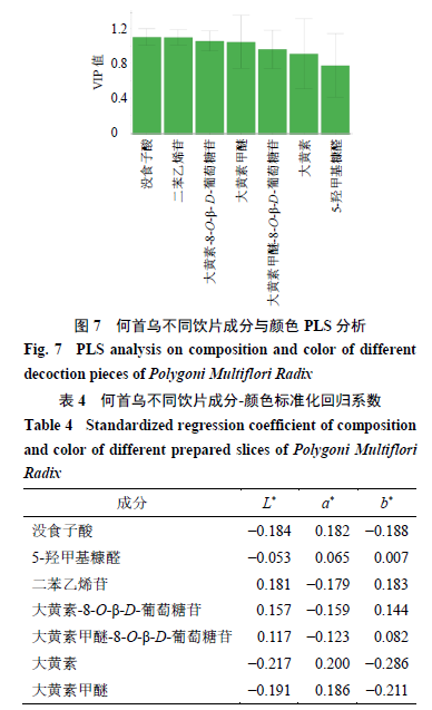 2.5何首烏不同飲片主要成分含量與顏色變化的相關(guān)性分析 普通多元線(xiàn)性回歸建模前提必須滿(mǎn)足樣本數(shù)量較多,變量數(shù)量較少,且變量之間無(wú)多重共線(xiàn)性的條件才具有合理性,若數(shù)據(jù)不能完全滿(mǎn)足上述條件,則模型無(wú)法使用。本實(shí)驗(yàn)中變量較多,且成分之間存在多重共線(xiàn)性的問(wèn)題,因此無(wú)法采用普通多元線(xiàn)性回歸模型。偏最小二乘回歸(partial least squares regression,PLS)法可以提取出對(duì)因變量解釋最強(qiáng)、影響最大的綜合變量,辨識(shí)系統(tǒng)中的信息與噪聲,因此很大程度上能夠克服變量之間的多重相關(guān)性在回歸建模中的不良作用,可以有效地解決在普通多元線(xiàn)性回歸的建模過(guò)程中因自變量之間存在多重相關(guān)性而影響參數(shù)估計(jì)的準(zhǔn)確性和合理性的問(wèn)題,縮小模型誤差,增強(qiáng)模型的穩(wěn)健性[19]。 在PLS回歸模型中,R2X和R2Y分別表示模型對(duì)自變量和因變量的解釋能力,Q2表示模型的預(yù)測(cè)能力,通常認(rèn)為上述3個(gè)指標(biāo)以大于0.5為宜,越接近1表示模型擬合數(shù)據(jù)效果越好;自變量在解釋因變量時(shí)作用的重要性可以用變量投影重要性指標(biāo)(VIP)來(lái)度量,通常認(rèn)為VIP值大于1的自變量對(duì)因變量有顯著影響。 將測(cè)得的成分含量數(shù)據(jù)與顏色指標(biāo)L*、a*、b*值導(dǎo)入SIMCA 14.1軟件,以成分含量作為自變量,各顏色指標(biāo)作為因變量,建立PLS模型。建立的PLS模型R2X=0.991,R2Y=0.988,Q2=0.981,說(shuō)明建立的模型穩(wěn)定且預(yù)測(cè)能力較強(qiáng)。根據(jù)VIP值>1的原則,可發(fā)現(xiàn)沒(méi)食子酸、二苯乙烯苷、大黃素-8-O-β-D-葡萄糖苷、大黃素甲醚對(duì)何首烏的各顏色指標(biāo)有顯著影響,5-羥甲基糠醛、大黃素甲醚-8-O- β-D-葡萄糖苷、大黃素對(duì)何首烏顏色無(wú)顯著影響。見(jiàn)圖7。 根據(jù)PLS模型的回歸系數(shù)(表4),沒(méi)食子酸、大黃素、大黃素甲醚的含量與L*、b*值呈負(fù)相關(guān),與a*值呈正相關(guān);5-羥甲基糠醛的含量與L*值呈負(fù)相關(guān),與a*、b*值呈正相關(guān);二苯乙烯苷、大黃素-8-O-β-D-葡萄糖苷、大黃素甲醚-8-O-β-D-葡萄糖苷的含量與L*、b*值呈正相關(guān),與a*值呈負(fù)相關(guān)。提示沒(méi)食子酸、大黃素、大黃素甲醚這3種成分與何首烏飲片變深、變紅、變藍(lán)有關(guān),與炮制后何首烏飲片顏色總體變化相一致;二苯乙烯苷、大黃素-8-O-β-D-葡萄糖苷、大黃素甲醚-8-O-β-D-葡萄糖苷這3種成分與何首烏飲片變淺、變綠、變黃有關(guān),與炮制后何首烏飲片顏色總體變化相反。