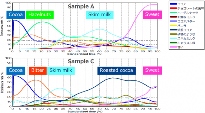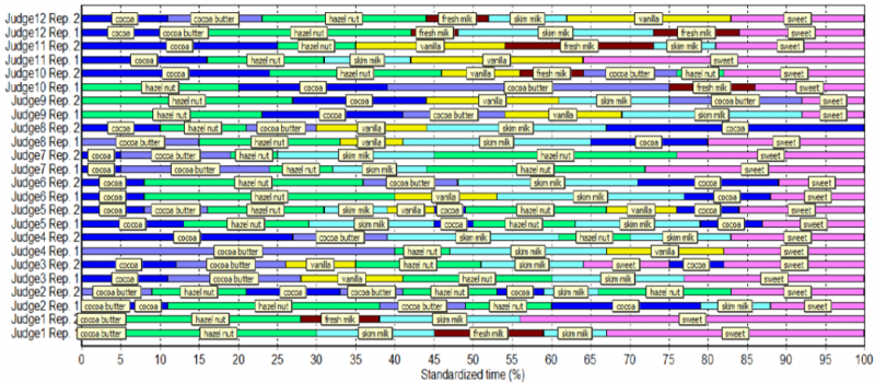 TDS品評法 旨在收集受試者在品嘗產(chǎn)品期間感知到的主要感覺的序列。例如,在品嘗一塊巧克力時,從攝入到吞咽,品評人員可以依次感知可可、可可脂、榛子可可和甜味等屬性作為主導(dǎo)感覺。
