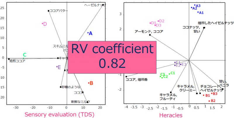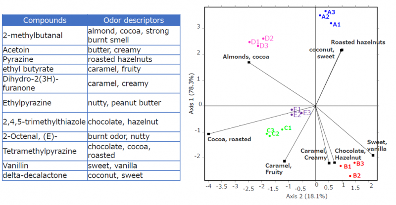 通過TDS持續(xù)時間生成的主成分分析圖:A,B,C,D,E 這幾個樣品都有不同的感官特征,比如A產(chǎn)品的榛子味濃一些,C產(chǎn)品的烤可可味更濃一些。