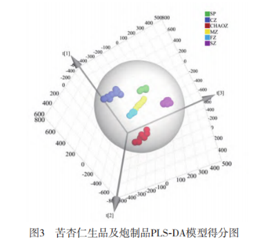 本研究發(fā)現(xiàn)苦杏仁經(jīng)高溫炒制和蜜制后,苯甲醛含量顯著升高,通過簡便快速的FGC E-Nose結(jié)合化學(xué)計量學(xué)明確了不同炮制工藝對苦杏仁揮發(fā)性成分的影響,高溫炮制增加了揮發(fā)性成分的組成和含量,去油制霜損失了大部分揮發(fā)性成分,這很可能是炮制發(fā)揮了“減毒增效”作用的關(guān)鍵因素。