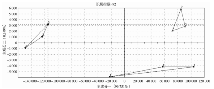 結果與分析 不同發(fā)酵方式柿子酒揮發(fā)性香氣成分分析 電子鼻對不同發(fā)酵方式柿子酒進行主成分分析 由圖1可知,第一主成分對數(shù)據信息貢獻率為99.751%,第二主成分貢獻率為0.149%,兩個主成分的總貢獻率為99.900%,表明此圖譜能夠較好地反應所測樣品中氣味數(shù)據的完整性。識別指數(shù)為92,在80~100之間,表示該數(shù)據區(qū)分分析結果為有效結果,識別指數(shù)值越大,區(qū)分效果越佳。