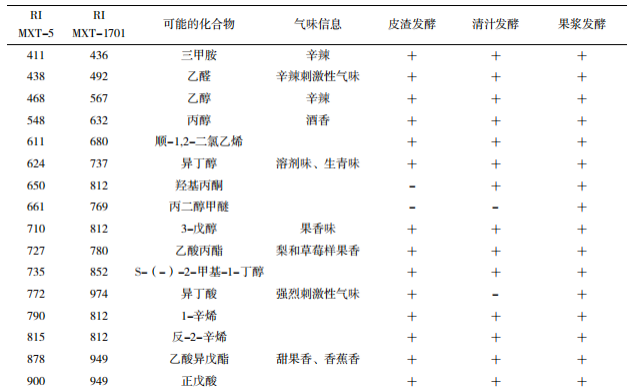 圖3 不同發(fā)酵方式的柿子酒的判別因子分析 電子鼻對不同發(fā)酵方式柿子酒揮發(fā)性香氣成分的定性分析 由表2可知,3種發(fā)酵方式柿子酒的香氣成分中大部分化合物都有存在,其中,醇類、酯類等分子量較小的揮發(fā)性物質占絕大多數(shù)。皮渣發(fā)酵、清汁發(fā)酵、果漿發(fā)酵柿子酒的香氣成分中醇類和酯類分別約占50%、52%和46%。3種方式發(fā)酵柿子酒香氣成分中都含有3-戊醇(果香味)、乙酸丙酯(梨和草莓樣果香)、辛醇(強烈的柑橘香氣)、己酸丁酯(特有的菠蘿香氣),使柿子酒增添了獨特風味。皮渣發(fā)酵中含有β-紫羅酮(紫羅蘭、甜果香),清汁發(fā)酵中含有正壬基苯和磷酸三丁酯,果漿發(fā)酵中含有丙二醇甲醚,表示不同發(fā)酵方式柿子酒的香氣成分存在差異。 表2 不同發(fā)酵方式柿子酒中可能的風味信息