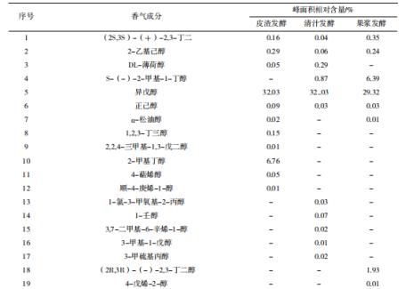 氣相-質譜聯(lián)用分析不同發(fā)酵方式柿子酒的香氣成分 由表3可知,異戊醇(蘋果白蘭地香氣、辛辣味)、正己醇(草本植物、青草味)、丁二酸二乙酯(愉快氣味)、乙酸異丁酯(柔和水果酯香味)等是柿子酒香氣成分中相對峰面積最高的物質,為柿子酒香氣成分中的主要成分。
