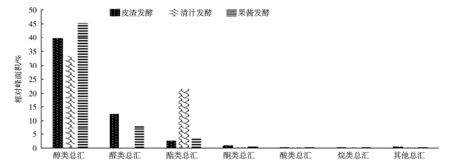 由圖4可知,3種發(fā)酵方式柿子酒的香氣成分大部分為醇類、酯類、醛類,醇類是柿子酒香氣的主要成分。皮渣發(fā)酵、清汁發(fā)酵、果漿發(fā)酵總醇類相對峰面積分別為39.62%、33.47%、45.32%,其中異戊醇相對峰面積最高,分別為32.03%、32.03%、29.32%。皮渣發(fā)酵、清汁發(fā)酵、果漿發(fā)酵總酯類相對峰面積分別為2.79%、21.65%、3.53%,其中丁二酸二乙酯相對峰面積最高,分別為1.18%、0.04%、1.39%。皮渣發(fā)酵、清汁發(fā)酵、果漿發(fā)酵總醛類相對峰面積分別為12.56%、0.00%、7.97%,其中縮醛相對峰面積最高,分別為12.43%、0.00%、7.85%。酸類、烷類、酚類和其他類物質含量較低,對酒的香氣起重要的修飾作用。清汁發(fā)酵柿子酒香氣成分中酯類數(shù)量最多,為27種,果漿發(fā)酵次之。清汁發(fā)酵的柿子酒香氣更濃郁,具有典型性。