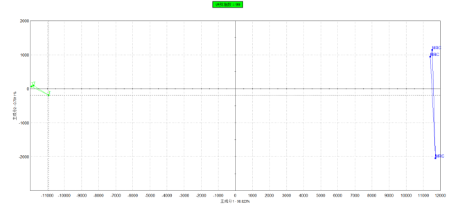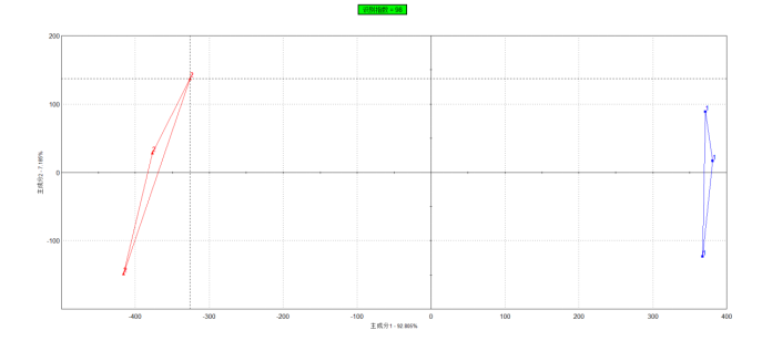 PCA是將采集到的氣味成分的種類和含量作為變量,通過向量變化以更直觀的形式體現(xiàn)樣品間的氣味組成差異,圖2為原始PCA圖(以所有色譜峰為變量)。第一主成分(PC1)與 第二主成分(PC2)的貢獻率之和達到了 99.6141%,能較為完整的代表樣品的全部信息;樣品間的差異主要反應(yīng)在橫軸上距離的遠近(第一主成分貢獻率顯著 93.823%)。2個樣品在主成分分析圖上的區(qū)分指數(shù)達到(Discrimination Index)99,說明超快速氣相色譜電子鼻(Heracles)能夠基于氣味的差異,有效區(qū)分2個牛奶樣品。