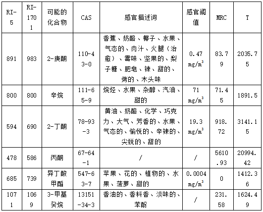 Discrimination power參數(shù)是根據(jù)化合物在不同組樣品中的分布計算得來, 若化合物的分布差異較大,例如某組含有此化合物而另外一組中未檢出此化合物,則計算出的Discrimination power越接近于1。若化合物在各組中分布較為均勻,則discrimination power 參數(shù)計算結(jié)果趨近于0。對于篩選出的差異化合物組分使用Arochembase數(shù)據(jù)庫進行檢索,嘗試定性和查找化合物的氣味屬性及閾值信息,可以衡量此化合物在氣味中的貢獻程度大小。