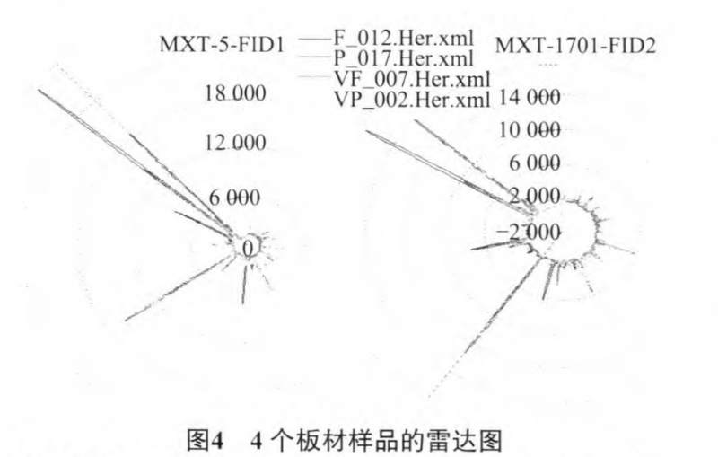 可將氣相色譜信息處理成雷達(dá)圖的形式(圖4),更為形象地展現(xiàn)樣品區(qū)別。出現(xiàn)較大的成分區(qū)別的原因:1)生產(chǎn)板材所使用的原料不同;2)板材生產(chǎn)過程中的工藝、施膠量、施膠種類、時(shí)間及是否貼面等的區(qū)別。這為分辨不同板材提供了有力的證明。